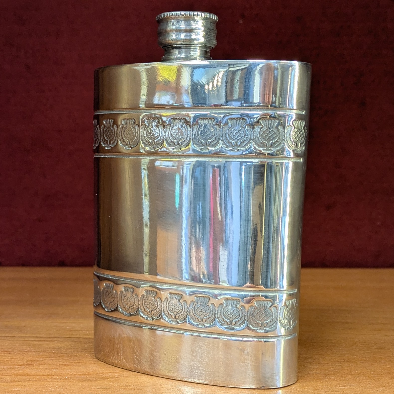 A stylish 4oz Pewter Hip Flask with a Thistle Band design.